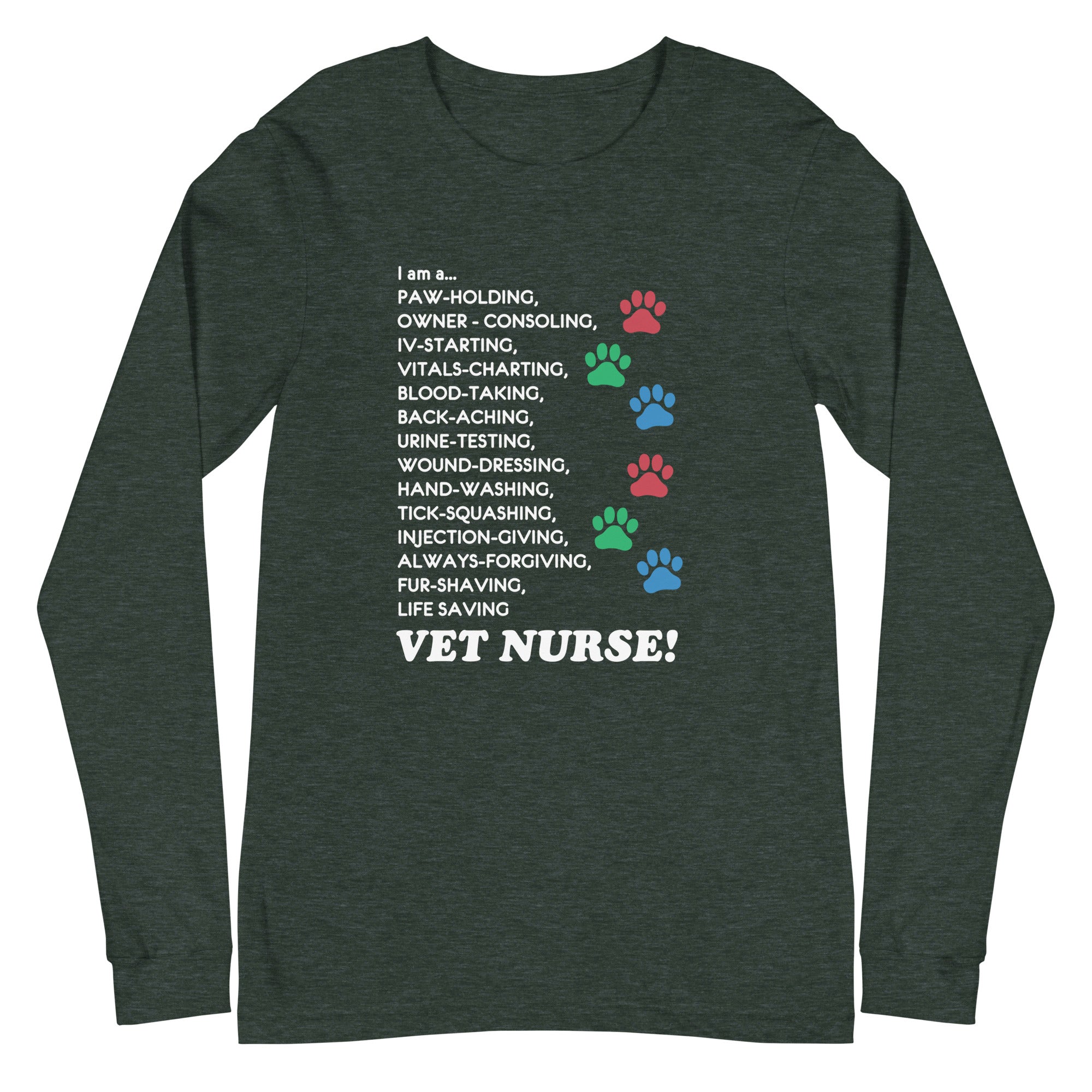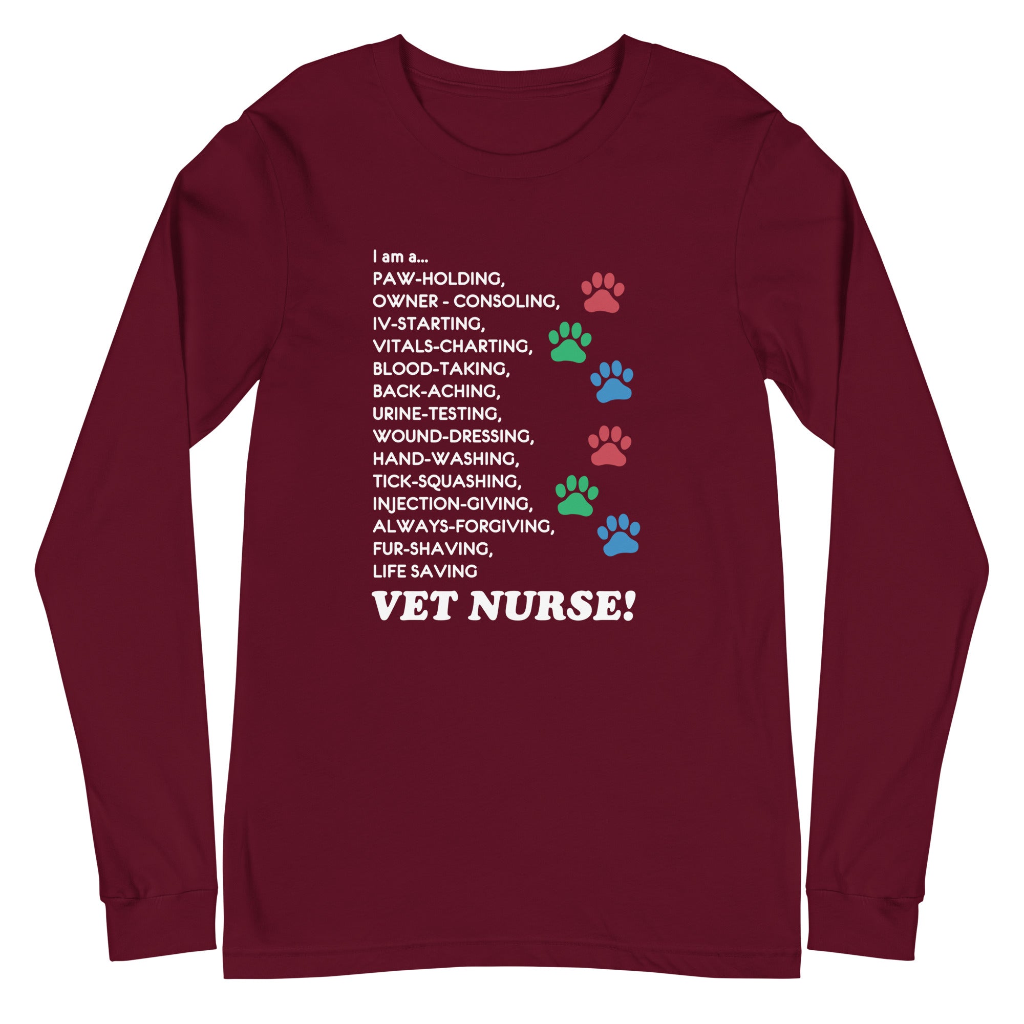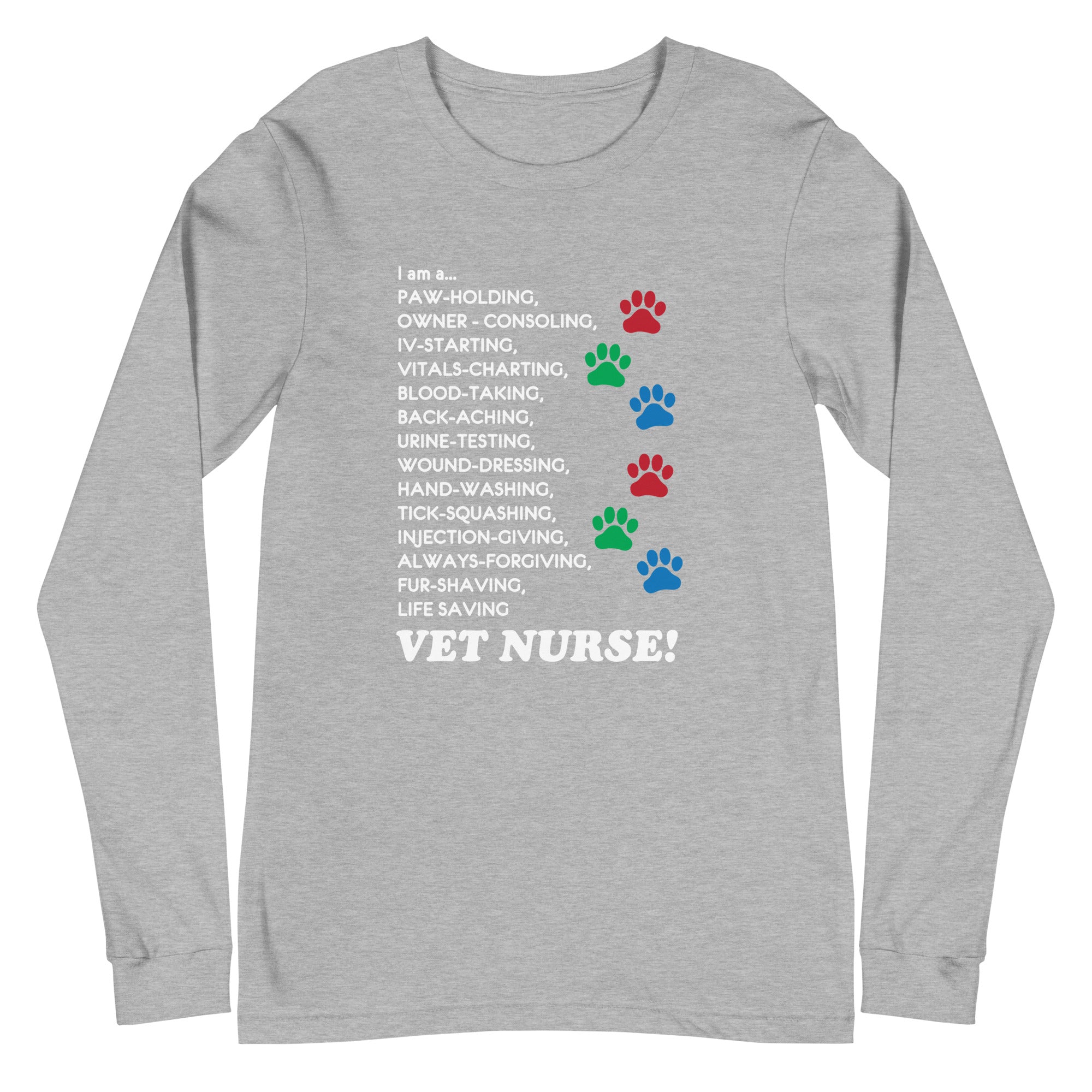 This I am a… Vet Nurse Unisex Long Sleeve Tee will be your favorite long sleeve this Winter. As a part of vet nurse medicine, you can wear it at the clinic under your white coat or when going out. This Long Sleeve will keep you warm and cozy, and you can show how much you love your profession and animals. It’s an excellent gift idea for Christmas, Vet Tech Week, or World Veterinary Day. Perfect as a part of the clinic wear for the staff. If you don’t feel like wearing a white coat over your scrubs, a long sleeve under your scrubs is always a good idea to keep you warm. This is perfect for birthdays, Mother’s Day, Father’s Day, Christmas, or any other special occasion. Find other cool t-shirts, hoodies, and zip hoodies for vets, vet techs, vet students, vet receptionists, and anyone involved in the veterinary profession!The unisex long sleeve is not fitted and is perfect if you prefer a looser fit.SKU: ILV00081
